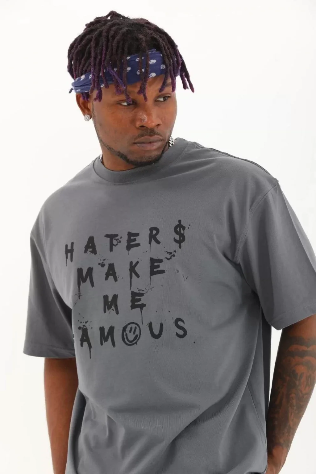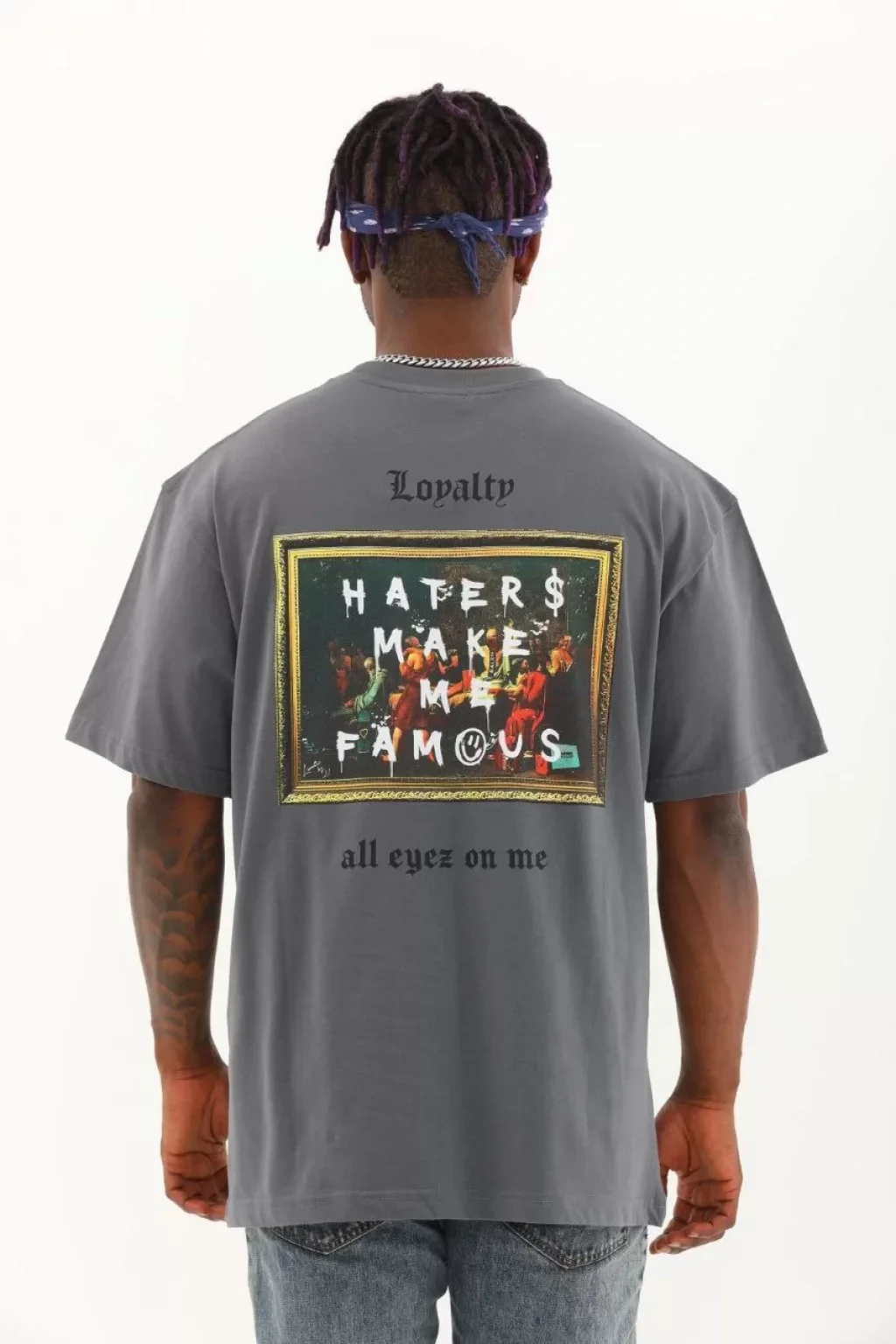 Unisex Oversize Baskılı Bisiklet Yaka T-Shirt - Füme