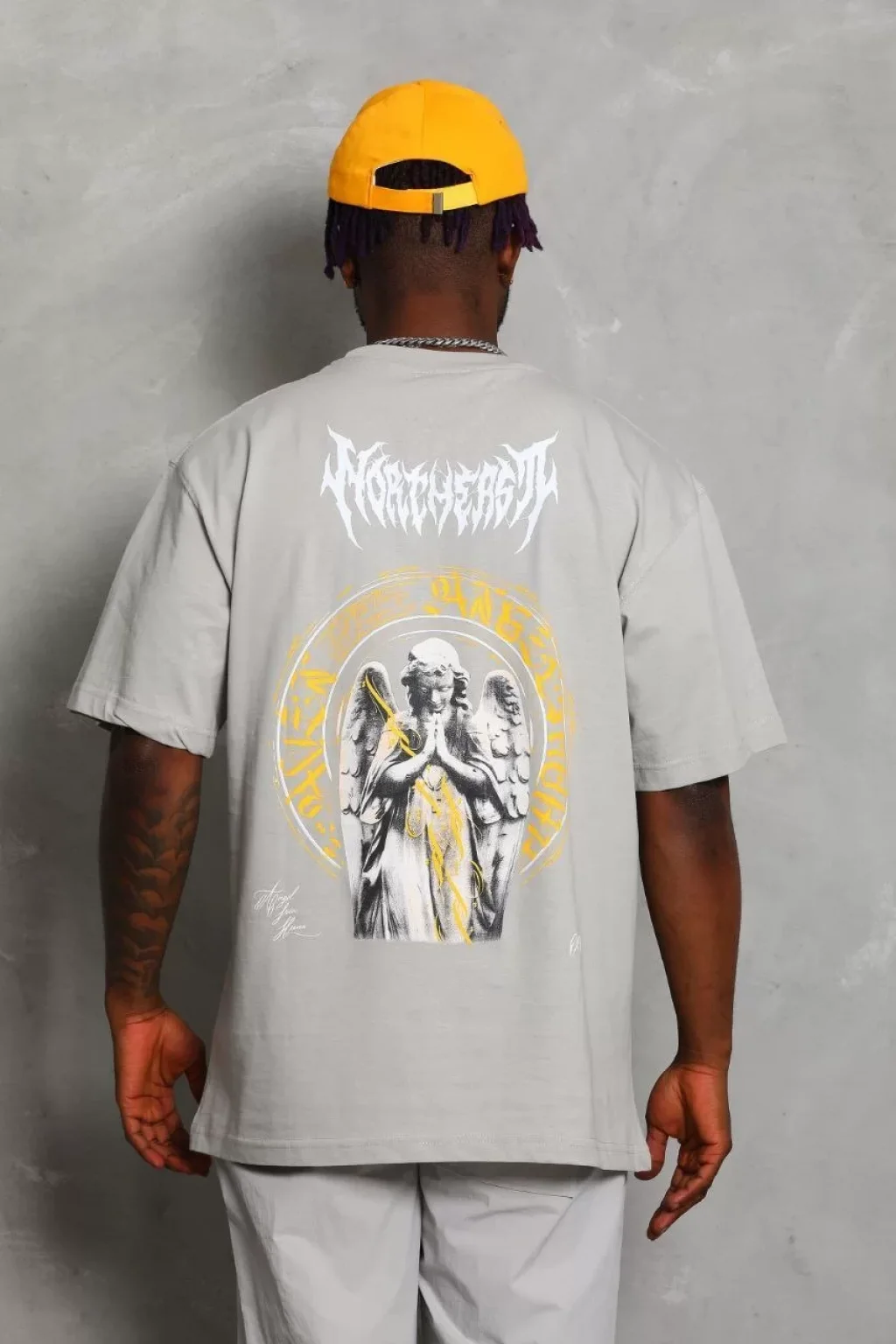 Unisex Oversize Baskılı Bisiklet Yaka T-Shirt - Gri