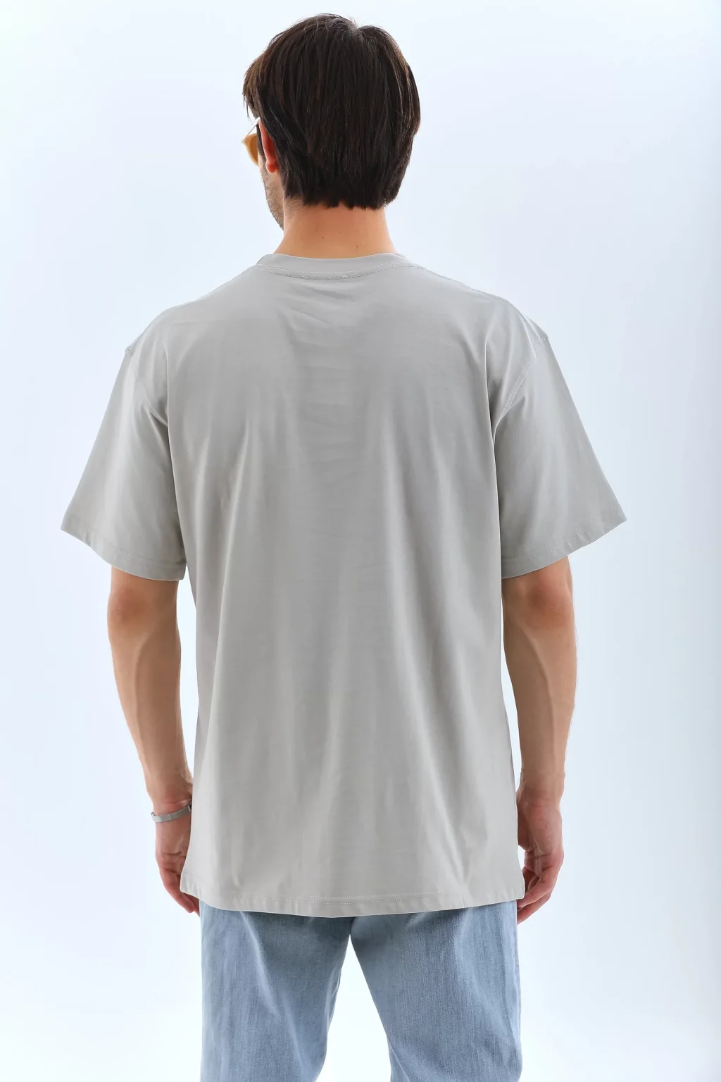 Unisex Oversize Taşlı Bisiklet Yaka T-Shirt - Gri