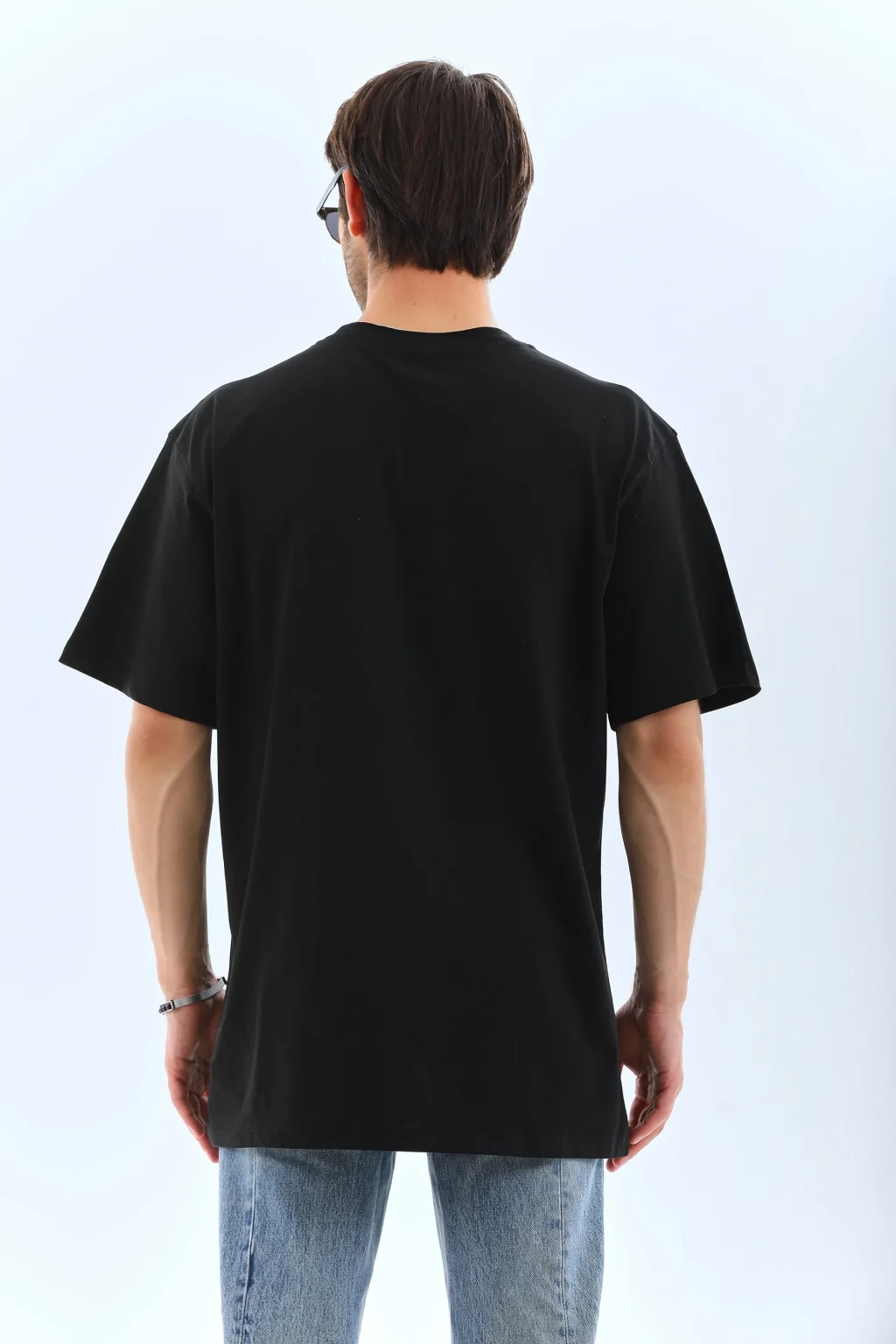 Unisex Oversize Taşlı Bisiklet Yaka T-Shirt - Siyah
