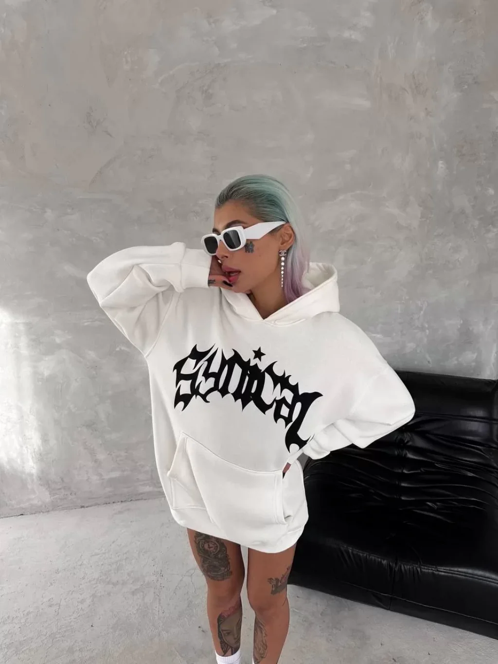 Unisex Üç İplik Kapüşonlu Baskılı SweatShirt - Beyaz
