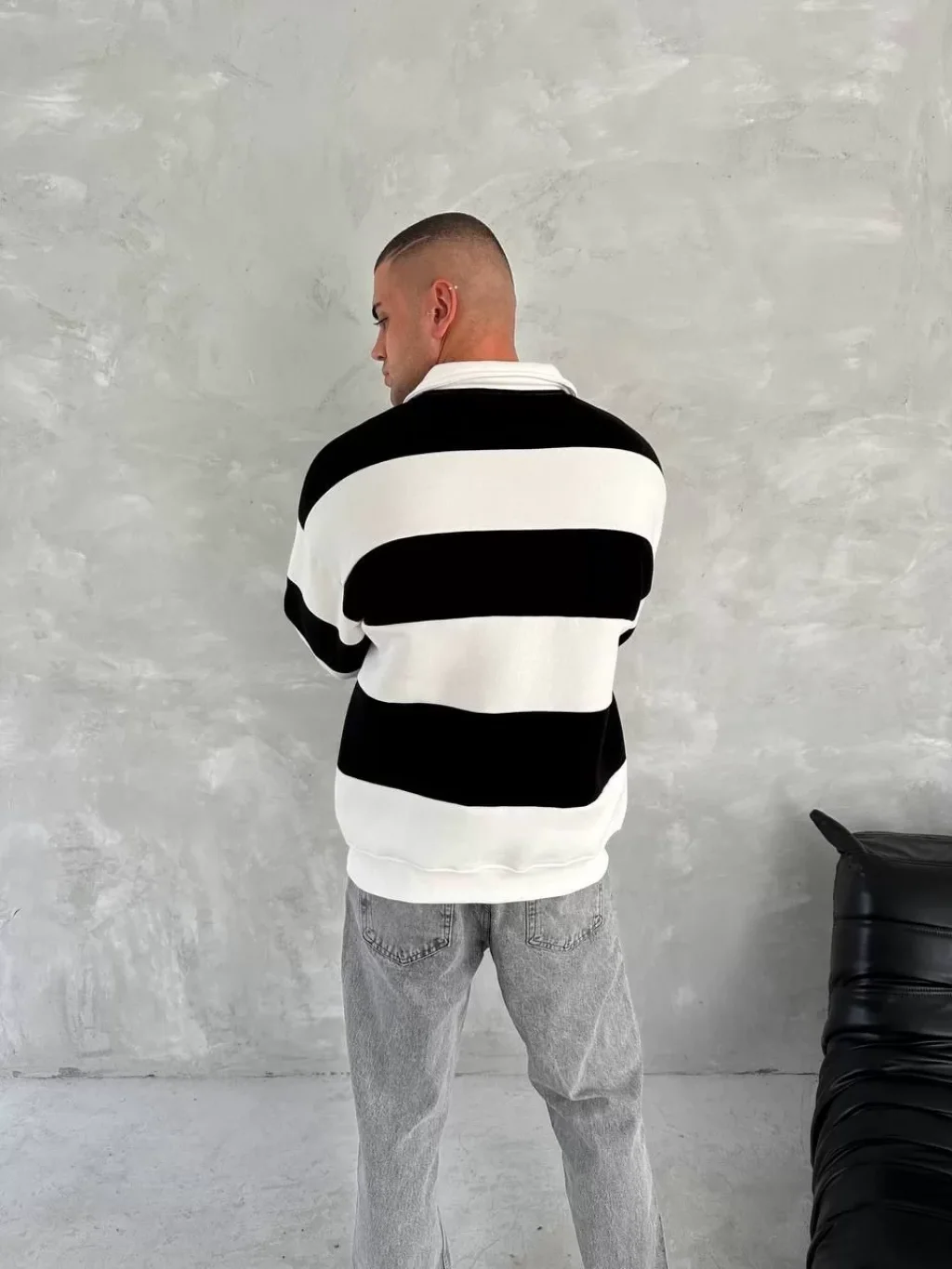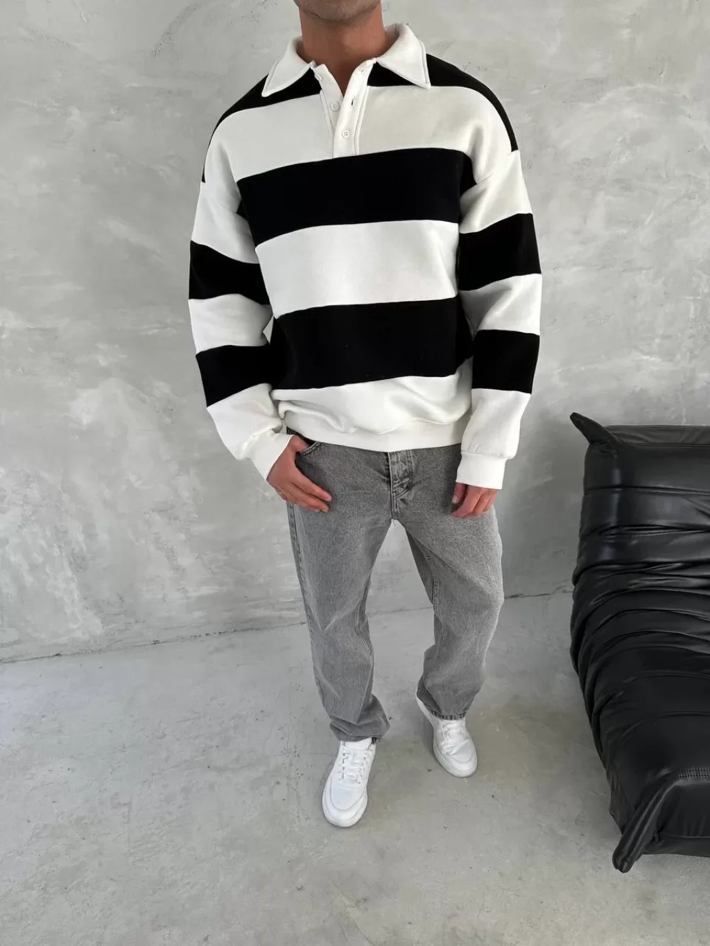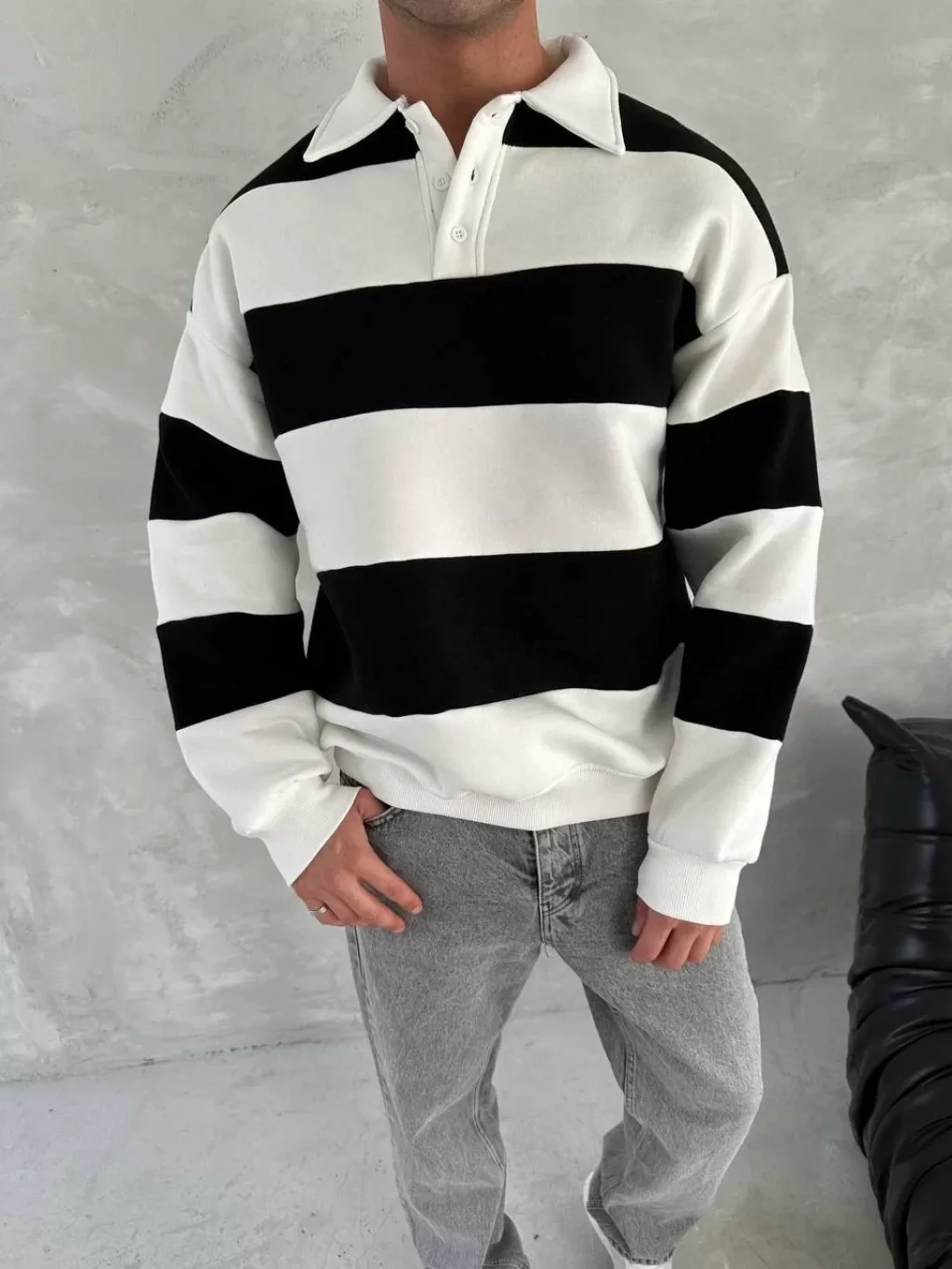 Unisex Üç İplik Parçalı Yakalı SweatShirt - Siyah