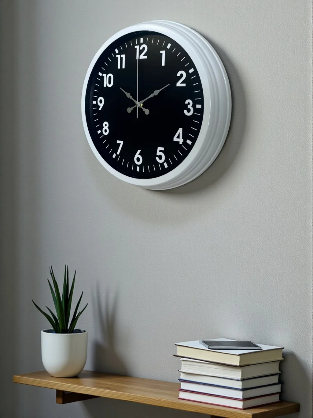 Modern tasarımı ve güçlü kontrast yapısıyla dikkat çeken bu duvar saati, beyaz metal kasası ve siyah kadranı sayesinde bulunduğu ortama sofistike ve şık bir hava katar. Net rakam tasarımı, yüksek okunabilirlik sunarken; klasik ve modern çizgileri bir arada barındırmasıyla hem ev hem de ofis kullanımı için ideal bir üründür.
