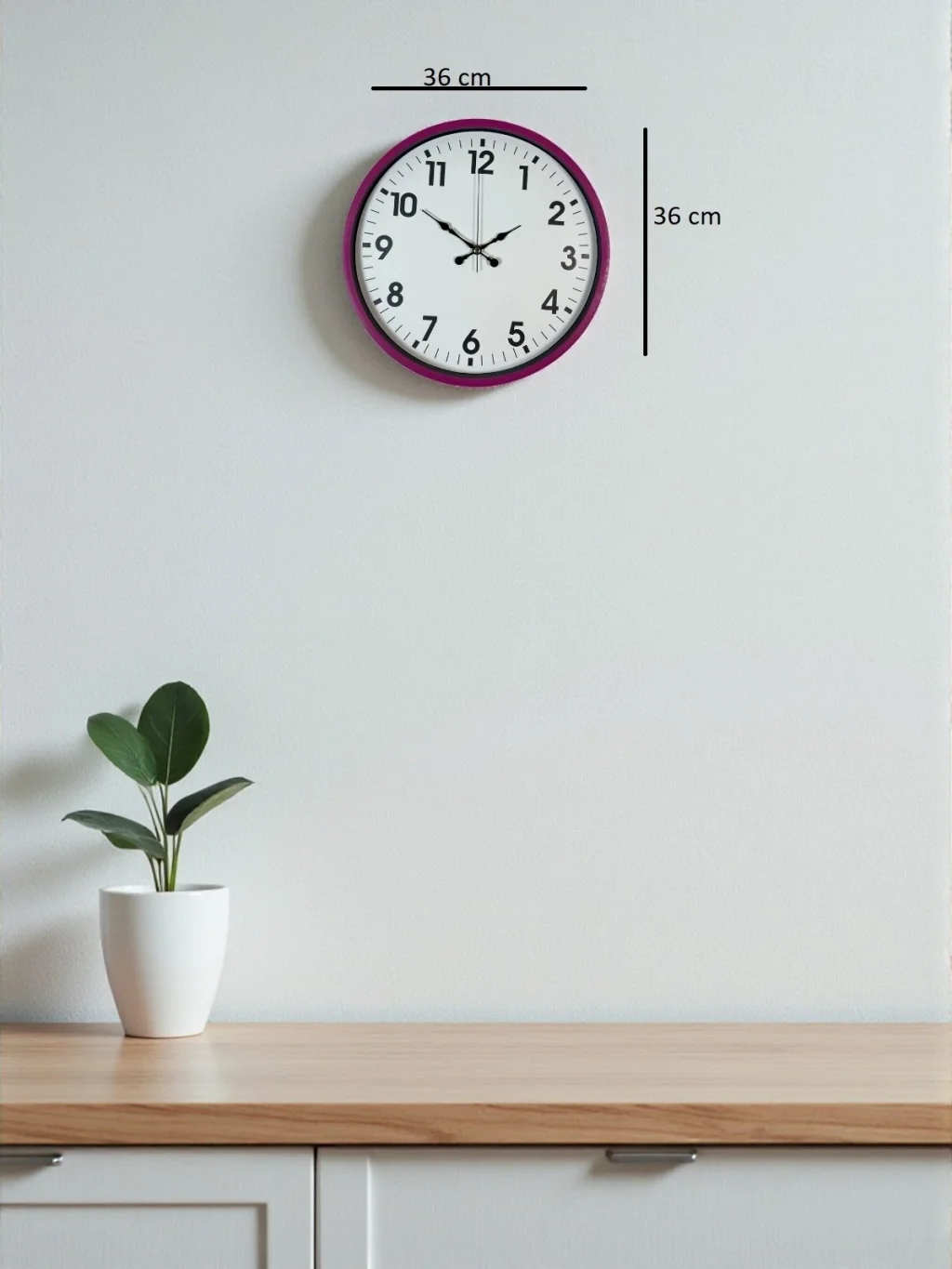 Yaşam alanlarına enerji, renk ve modernlik katan 36 x 36 cm mor/pembe çerçeveli duvar saati, sade fakat dikkat çekici tasarımıyla dekorasyonunuzu tamamlayan şık bir aksesuardır. Beyaz kadranı, büyük siyah rakamları ve canlı çerçeve rengi sayesinde hem modern hem de genç odalarına uyum sağlar. Ev, ofis, mutfak, çalışma odası ve özellikle genç odaları için ideal bir tercihtir.
