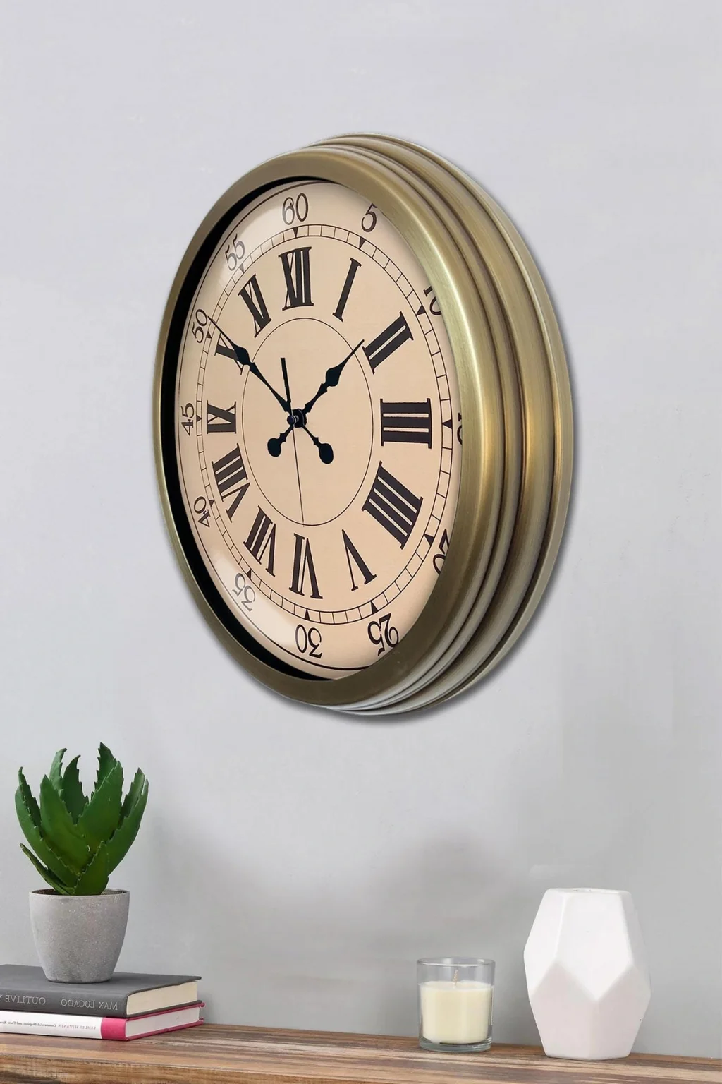 40 cm genişliği ile duvar dekorasyonunda merkez parça olabilecek bu eskitme duvar saati, klasik estetiği modern mekânlara taşıyan özel bir tasarıma sahiptir. Eskitme altın çerçeve, soft pembe-bej tonlarındaki kadran yüzeyi ve siyah Roma rakamları ile mükemmel bir uyum yakalar.