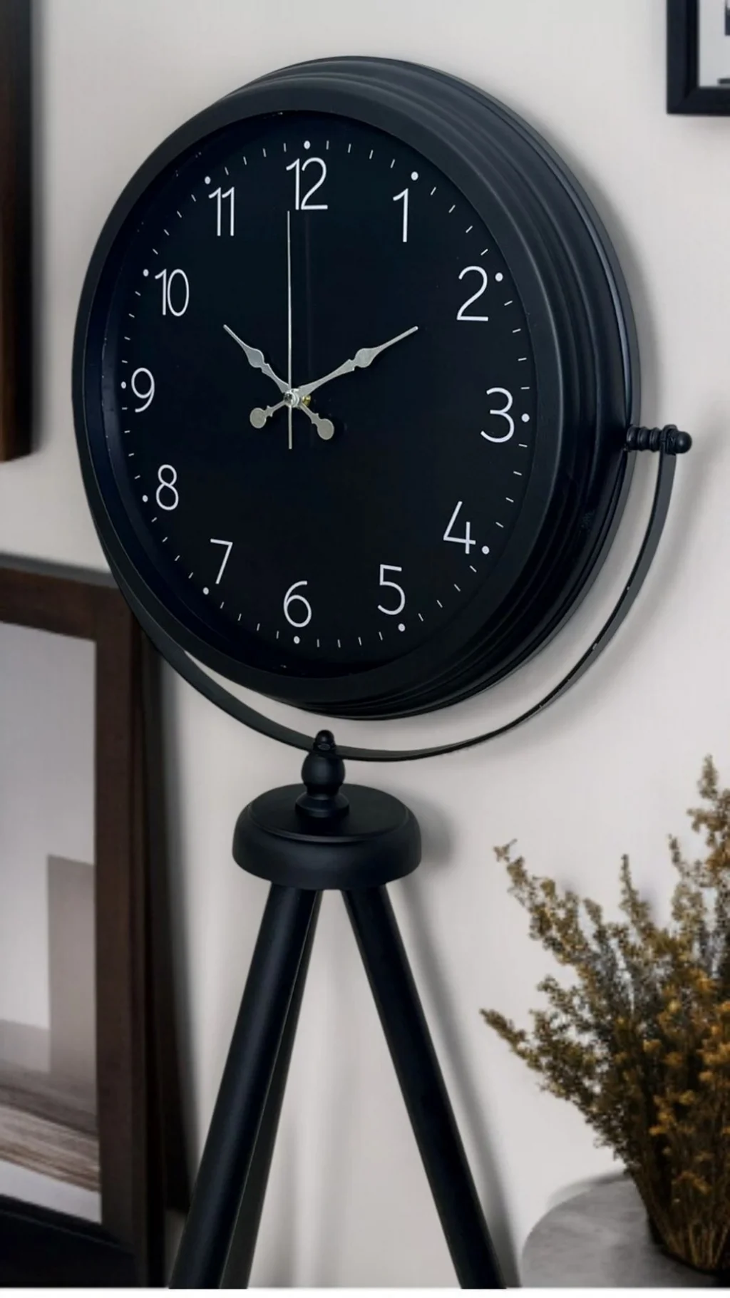 Yaşam alanlarında modern ve güçlü bir duruş isteyenler için tasarlanan Siyah Tripod Ayaklı Dekoratif Salon Saati, 150 x 45 cm ölçüsüyle salon, ofis ve geniş mekanlarda dikkat çeken bir dekor objesi olarak öne çıkar. Siyah metal tripod ayak formu, ürüne hem estetik hem de dengeli bir yapı kazandırırken; siyah kadran üzerindeki minimal rakam tasarımı modern çizgileri sevenler için zamansız bir şıklık sunar.